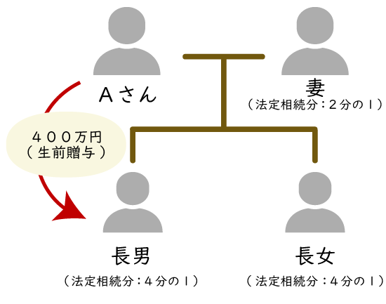 被相続人Aさんの相続人は、妻、長男、長女の3人で、Aさんの相続財産は2000万円です。Aさんは長男に400万円の生前贈与をしていたとします。